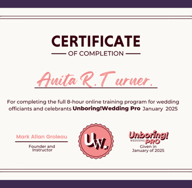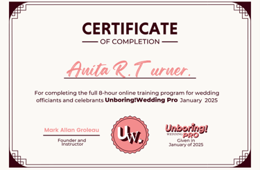 Having Earned My Certificate as an Unboring Pro Means Your Officiant (Me) Has the Training to Deliver a Couples' Unique Love Story written to bring personality, joy, and lightheartedness into your ceremony.